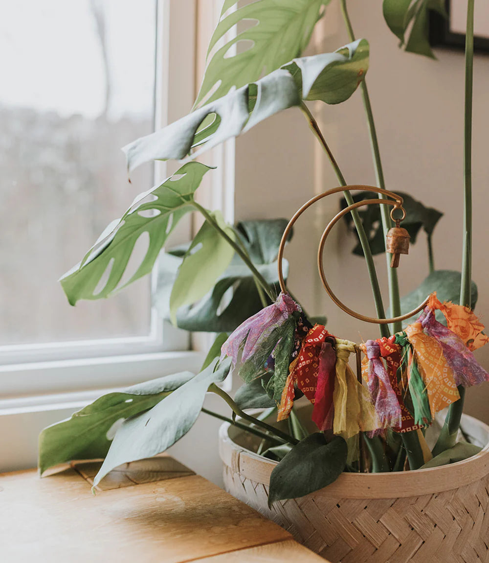 Dream big in your outdoor space with this alluring, handcrafted Indian bell garden stake chime. This fair trade metal garden stake is ethically handcrafted in India using age-old metal craft and bell making techniques. Bell making is a traditional artform which has been passed down for generations in certain regions of India. This nature inspired outdoor bell chime features a clean line crescent moon silhouette shape and hanging Indian cow bell. The piece is accented by vibrant sari tassels handcrafted with upcycled Indian textiles of assorted color and pattern. When the wind brings this metal yard art to life, the bell chime sings and the tassels dance. Gift this decorative garden stake wind chime to the beloved stargazer, gardener, green thumb, or garden fairy in your life. It makes a unique and thoughtful housewarming gift. For those who spend a lot of time indoors and at home, this piece can add a cheery pop of color and a reminder of you through the window. For those who spend more time outdoors, they can sing and dance along with the wind chimes’ song. For those who take great pride in their yard or garden and are exploring ideas for yard art or garden art, this eye-catching, intentionally crafted piece could make their day! *Due to the handmade and upcycled nature of our items, colors and designs of sari tassels cannot be determined or chosen. Each piece is a unique surprise and may not match the photo shown (photos are just an example).